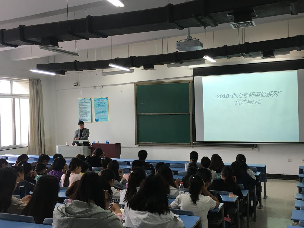 williamhill威廉希尔助力考研英语讲座第二讲“考研英语基础知识篇”于4月24日晚上、4月26日下午分别在英才校区和龙子湖校区举行,主讲人为旅游英语教研室教师秦礼峰。