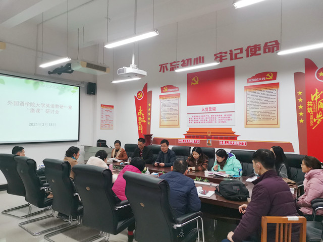 “磨课”活动中,各教研室课程组负责人首先根据前期课程研讨中头脑风暴的成果,针对评估期间的教学内容做了课程设计的示范展示。老师们的设计思路灵活、逻辑清晰、课程思政融入自然流畅。其中,大学英语教研一室刘冬阳老师结合单元主题Friendship,通过诗歌、图片、视频等引导学生理解如何建立积极向上的交友观以及如何看待疫情期间国与国之间友谊和“人类命运共同体”对全球人民友谊的卓越贡献。杨柳老师借用中国古代顾况戏白居易、李同献策、毛遂自荐等几则经典故事深入浅出地阐释了Job Hunting这一文中谷歌公司人力运营高级副总裁提出的年轻人找工作时应当具备的几点品质。随后,老师们针对具体授课内容,纷纷阐述了课程教学的设计思路,从教学材料的选取、教学方式的应用等方面进行了热烈讨论,尤其是对于如何有效实现教学目标、合理融入课程思政、如何根据实际学情开展课堂教学等方面展开了充分的交流。各教研室主任强调,老师们在备课、授课等各个环节中要精准到内容,即教学内容必须与教学文件特别是课程大纲、授课计划相一致;要精准到各教学环节,即课前回顾、课中展开、师生互动、课内小结、作业布置等各个环节都要用心设计;要精准到时间的把控,即确保课堂上每个教学环节的用时分配合理流畅;要精准到课课有亮点、处处有闪光点,特别是结合单元主题要自然融入课程思政元素。