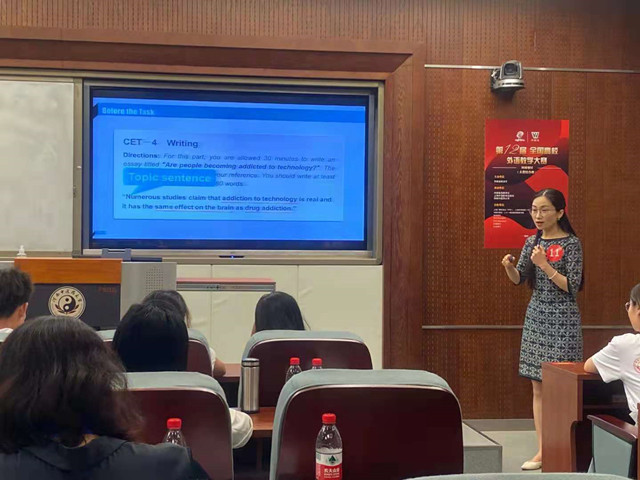 经过复赛一天的激烈角逐,我院两位老师以分别小组第3名的优异成绩晋级决赛,决赛分为三个环节:首先要求选手在30分钟时间内完成对一篇文章的分析理解并做好课堂教学初步设计,再以说课(10分钟时间)的形式进行展示,最后接受专家评委的现场提问。决赛环节难度大、挑战度高,考验选手的知识储备、教学语料组织和教学设计的能力,我院两名教师沉着冷静,发挥出色,展示了扎实的基本功底和丰富的教学经验,最终荣获两个组别的三等奖。