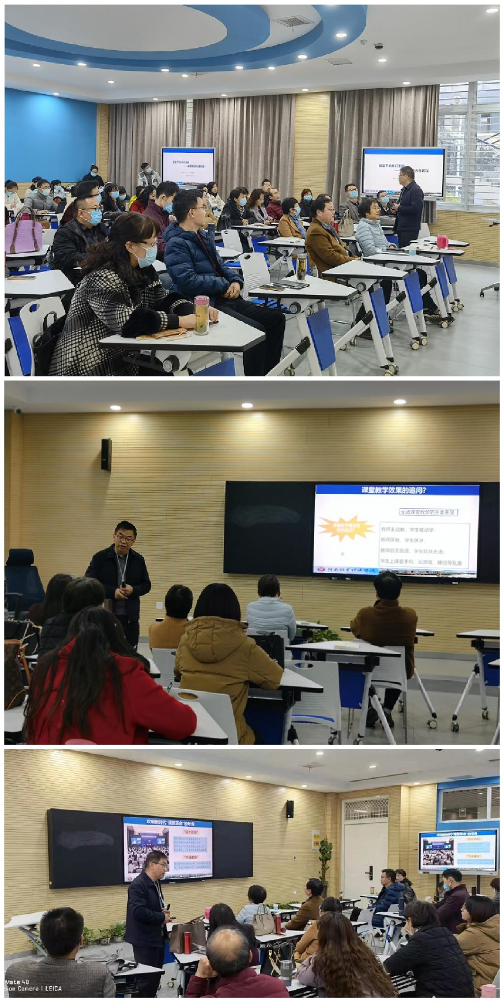 李海舰教授以建构主义理论为切入点,从课堂教学改革的缘起、课堂教学改革的理论、课堂教学改革的内容、课堂教学改革的启示四方面就如何开展课堂教学改革进行了详细的讲解,指出全世界的课堂都在由‘教授的场所’转变为‘学习的场所’;从以‘目标-达成-评价’的程序型课程转变为以‘主题-探究-表现’的项目型课程;课堂教学改革是对传统“教师中心”课堂的彻底宣战,是世界性的趋势。课堂教学是学校教育的主渠道,高校要实现“为党育人、为国育才”的历史使命,必须进行“课堂革命”。广大教师要既要识变,要应变,更要求变。辅导报告结束后,李主任与参会教师进行了热烈的互动交流,认真解答了老师们提出的问题,得到大家的一致好评。