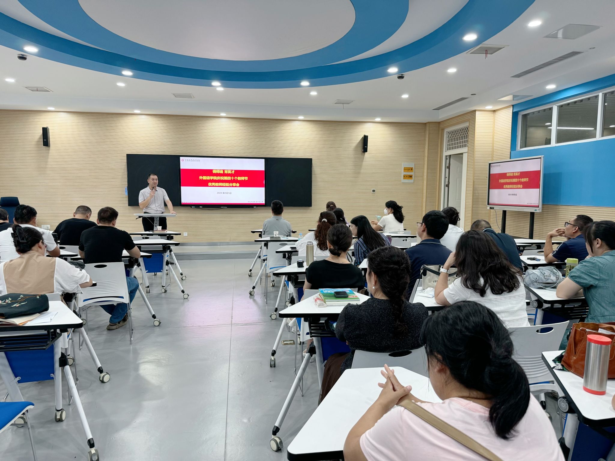 为迎接第40个教师节的到来,大力弘扬教育家精神,加强新时代高素质专业化教师队伍建设,近日,williamhill威廉希尔在龙子湖校区一号教学楼举办了优秀教师经验分享会暨赴爱尔兰研修教师成果交流会。williamhill威廉希尔领导班子及全体教职工参会,副院长马媛媛主持了会议。