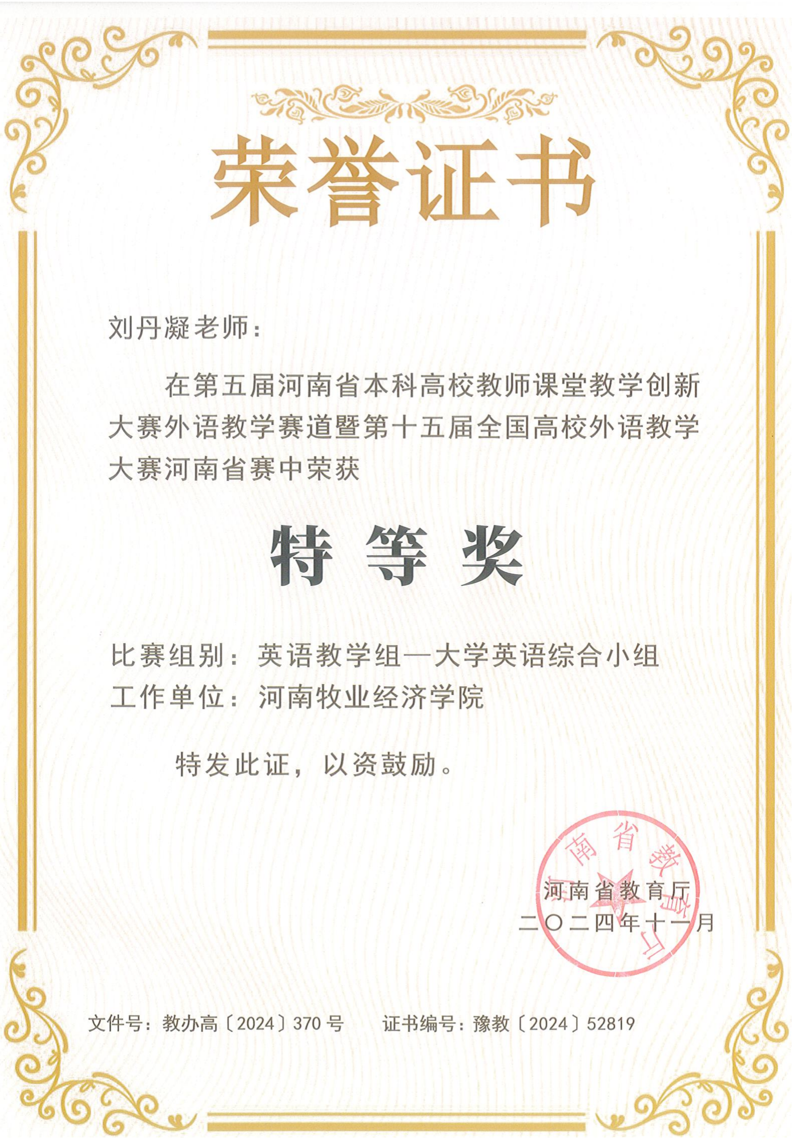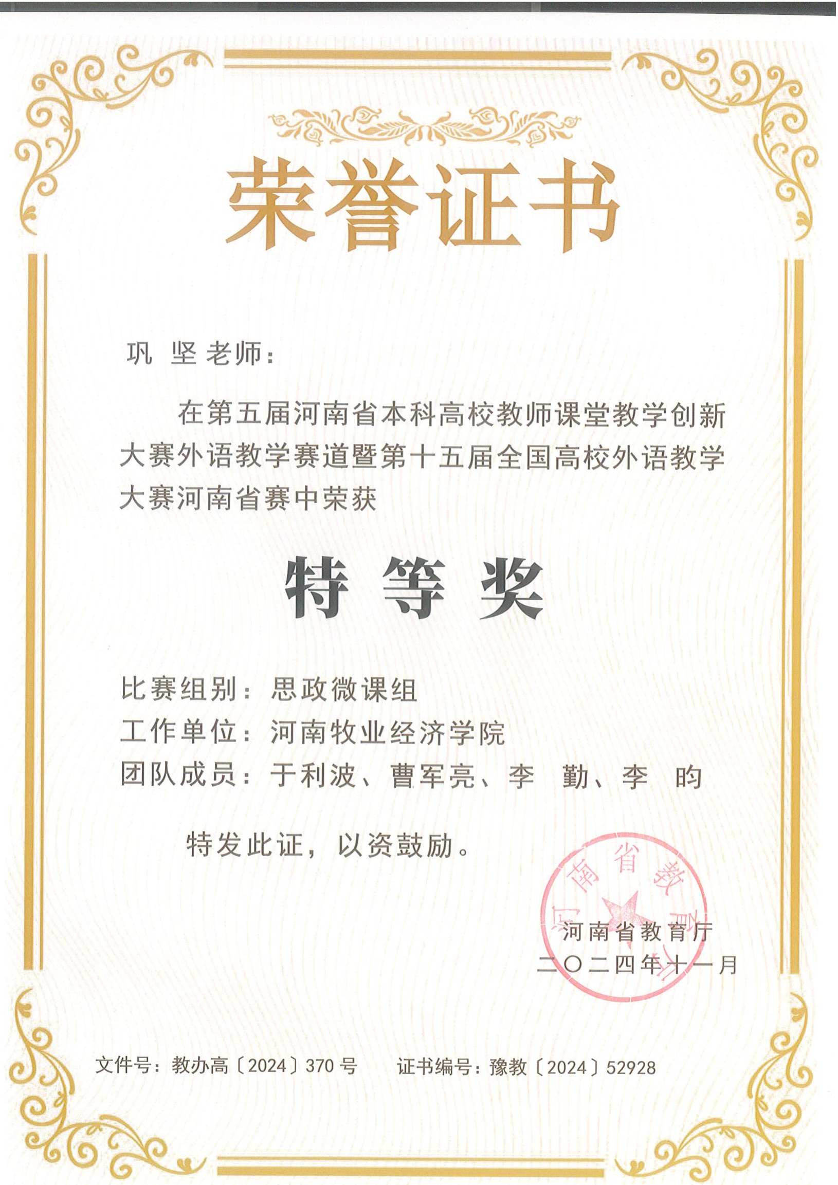 近日,河南省教育厅发文公布第五届河南省本科高校教师课堂教学创新大赛外语教学赛道暨第十五届全国高校外语教学大赛河南省赛获奖名单,我校参赛教师在英语教学组、思政微课组和跨文化组三个小组五项赛事中荣获特等奖两项,一等奖两项,二等奖一项,取得我校参赛最佳成绩。