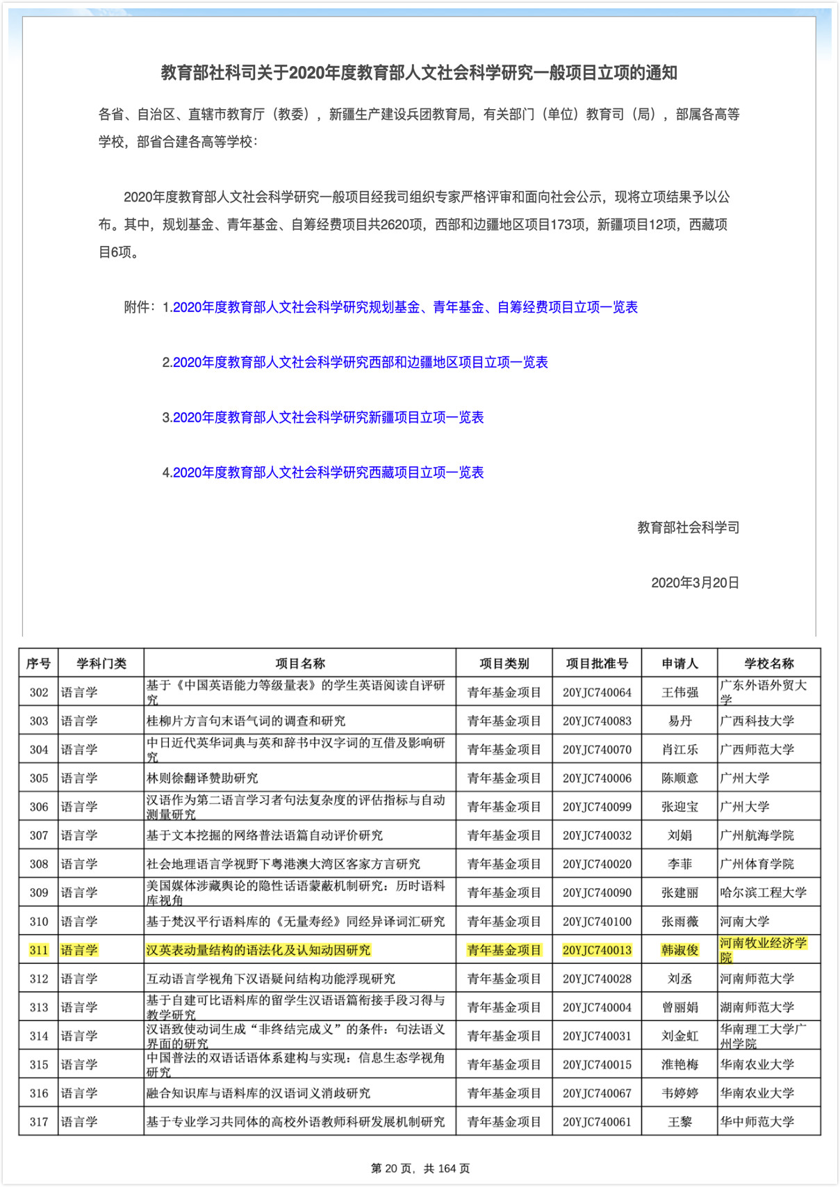 2020年3月20日,教育部社科司公布了2020年度教育部人文社会科学研究一般项目立项名单。我校williamhill威廉希尔青年教师韩淑俊博士主持的“英汉表动量结构的语法化及认知动因研究”喜获立项。