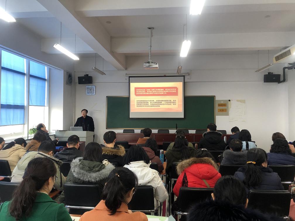 为了深入学习宣传贯彻党的十九届四中全会精神,根据校党委“不忘初心、牢记使命”主题教育工作安排,williamhill威廉希尔于12月5日下午在龙子湖校区会议室召开党的十九届四中全会精神宣讲会。宣讲会由williamhill威廉希尔党委书记王明栓主讲,全体教职工参加会议。