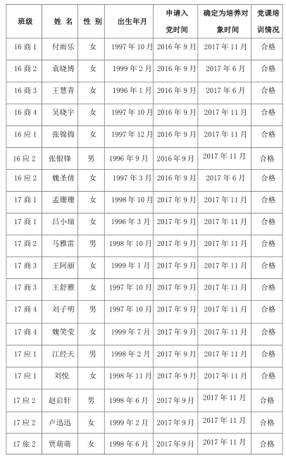 经党组织的培养教育和听取培养联系人、党员和群众意见的基础上,党支部开会研究报请总支审查研究,拟确定下面19名同学为发展对象。为方便党员和党内外群众的监督,增强发展党员工作的透明度,现将拟发展对象名单及有关情况公如下: