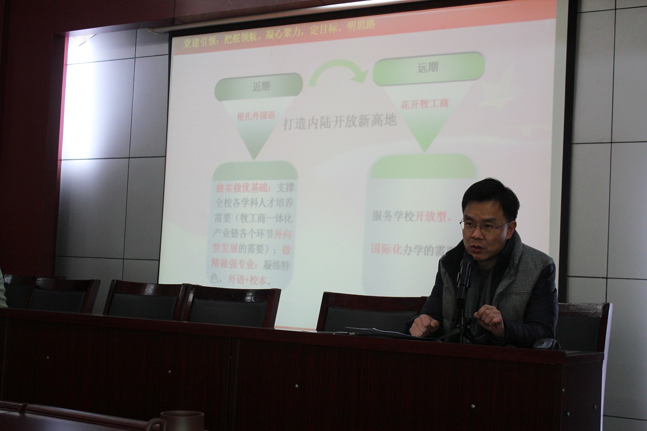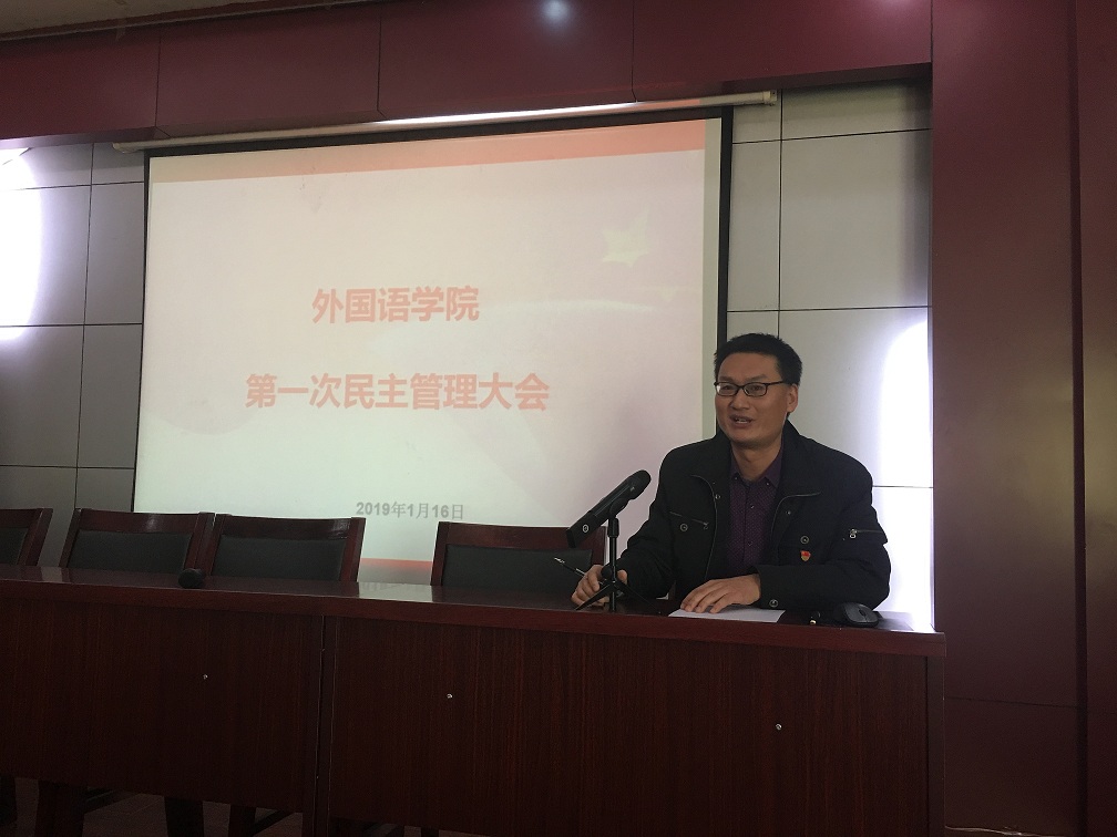 党总支书记、分工会主席弓峰山做了总结发言,他指出:民主管理大会的目的就是畅通渠道,汇集智慧,凝聚人心,我院作为学校融合发展的代表,既要做好学科专业建设,又承担着三个校区公共外语教学的繁重任务,我院通过抓班子带队伍促融合、抓党建带业务促发展,强化师德师风教风学风建设,初步形成了风清气正、团结和谐,积极向上的干事创业氛围,成绩的取得得益于大家的精诚团结和无私奉献;在新的一年希望大家开心工作、幸福生活,继续凝心聚力,实现我院持续、和谐、健康发展,弓书记代表院党政领导班子祝福大家新春快乐、喜乐安康、阖家幸福。
