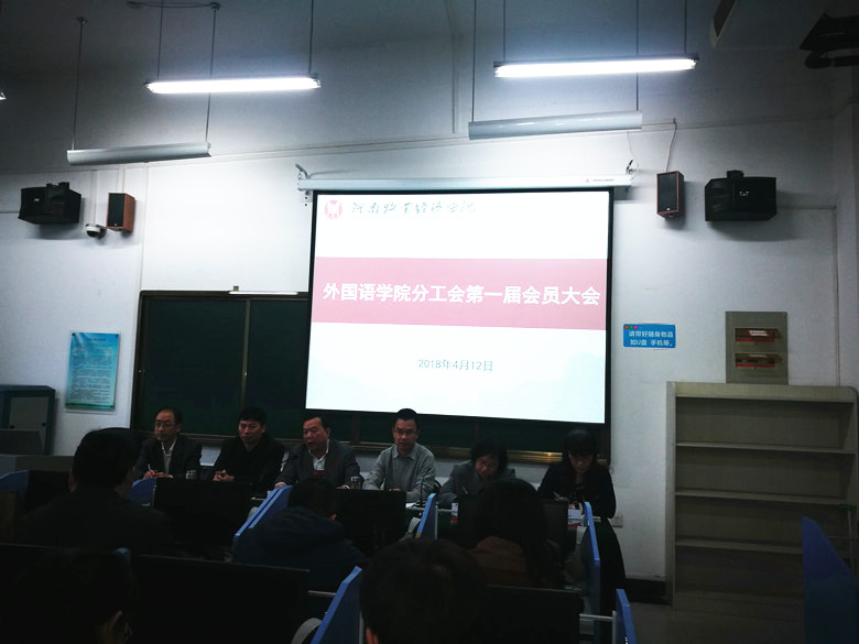 根据学校《关于建立健全分工会组织的通知》精神,williamhill威廉希尔第一届分工会会员大会于4月12日下午在龙子湖校区外语实训中心521多媒体语音实验室召开。会议由院党总支书记弓峰山主持,院领导班子成员及全体教职工出席了会议。