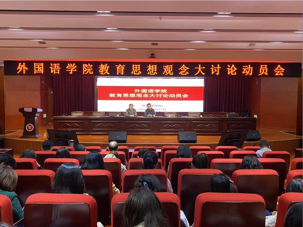 陈延潼院长在主持会议时要求全院教师认真学习领会学校关于开展教育思想观念大讨论的目的和意义,按照学院整体安排,认真参与,积极配合,做好各项工作的统筹兼顾,以此次大讨论的扎实开展为契机,紧跟高等教育发展的新理念、新要求和经济社会发展的新形势、新业态,立足学校建设发展新阶段,树立教育发展新理念,不断深化外语教育教学改革,加强外语学科和专业建设,凝练外语学科研究方向,聚焦社会服务功能提升,推进人才培养工作的高质量发展,为学院的“十四五”发展开好局,起好步。