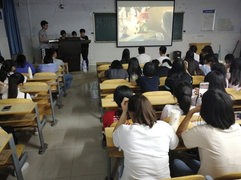晚7点,比赛正式开始,首先由主持人介绍参赛规则和要求,然后比赛在一首优美的个人独唱中开始。选手们通过不同的电影情节向观众们传达着电影的内在精神,疯狂动物城的搞笑可爱,泰坦尼克号的深情唯美,寻梦环游记的亲情感动……他们用自己丰富的感情表达技巧,向观众展示了一场视听盛宴。他们有的一人分饰两角,声音一会童稚可爱一会成熟稳重;有的两人互相配合,一个声音慷慨激昂,一个声音哀婉伤心;还有的三人整齐划一,声音做到了整齐一致,感情饱满。精彩的表演赢得了台下同学们连连喝彩。最后,李昀老师对比赛进行点评,对选手们的表演给予了肯定,并指出他们发音的错误和不足。