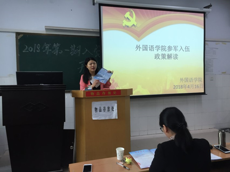 首先,刘老师就所有人最为关心的征兵的就学、就业、经济补助等方面政策进行了详细的解释说明,随后又向学生们介绍了2018征兵工作的预征对象、各项条件等内容。接着,陈书记为大家讲解有关学费减免、复学助学等相关政策。陈书记强调,当兵就是深造,入伍就是成才。参军入伍是大学生对自我的一种锻炼,在军队里面锻炼自己,成长自我。国家现在对大学生参军入伍有好的政策支持,同学们要积极了解参军入伍的政策,进行兵役登记,这是无上光荣的事情。