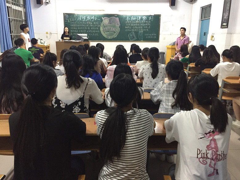 团课上,各班开展了形式多样的分享活动。17级旅英二班设计了一个文艺版的开场,主持人放着舒缓的音乐,轻声朗读着:读书是一种情怀,关照自然,渴望倾听,亲近生命,走入心灵。关于阅读的舒缓意境让同学们的心灵放松下来,用心体味阅读带给自己的力量。17级商英二班同学交流了近期所读的书籍,苏鹤鹤同学为大家推荐了西方经典名著《苏菲的世界》,并分享了自己的读书心得。17级应英1班的郭梦学同学说到:“对于我们新时代的青年来说,阅读应该成为我们生活之中必不可少的一部分。作为一名大学生,我们更要在学好专业知识的基础上,多读书,读好书,拓宽自己的知识面,加强自己综合素质的培养,这样才能在今后的学习和工作中事半功倍。”