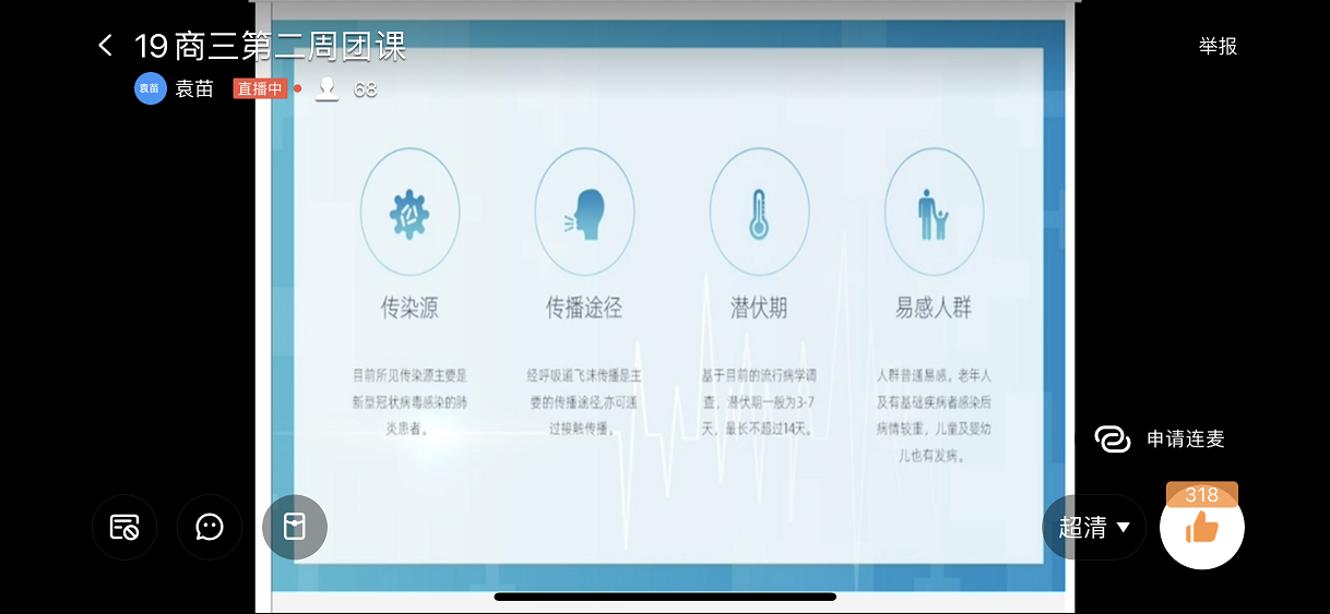 团课上,各班团支书利用钉钉直播软件,首先组织大家观看学习了河南省教育厅党组书记、厅长郑邦山在“河南省新型冠状病毒感染的肺炎疫情防控工作”第九场新闻发布会上的讲话。19商英01班团支书张雨微谈到“在聆听了郑厅长的发言后,感受颇深,心潮澎湃,懂得了打赢这场“战争”的重要性。我们共青团员要听从学校安排,保持联络畅通,不提前返校,每日积极汇报健康情况,不听谣不传谣,为打赢这场防疫战贡献力量。”商务英语二班,主持人精心制作了PPT为大家讲述了身边人在抗击疫情中的感人故事。同时,还积极展开线上互动,同学们争先恐后回答相关问题,活跃的氛围感染着每个同学。应用英语班主要以图文形式,直观的让大家学习在新冠病毒面前应该如何做、怎样做得更好。旅游英语班采用播放视频的方式,让同学们深切感受到了万众一心、攻坚克难的“中国力量”。副书记李燚,辅导员田春霞、刘萌、李昀老师深入各团支部,与团员青年们一起学习防疫知识,并引导团员青年遵守各项防控规定,督促大家踏实勤奋抓好学业。