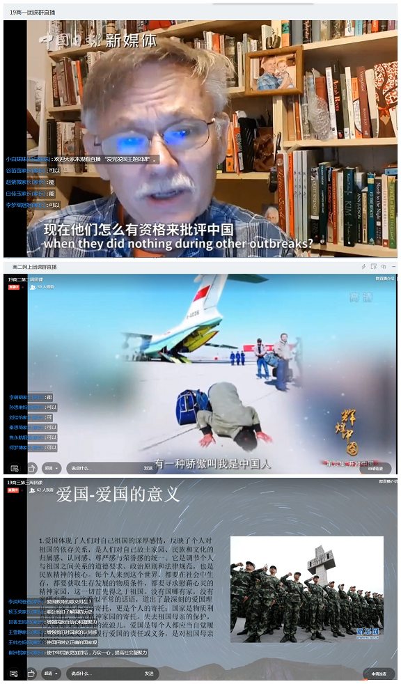团课伊始,各团支部开展了特殊的网上升旗仪式。同学们面向直播中的国旗肃立,听指挥高唱国歌,向祖国母亲致敬,向抗疫英雄致敬,为中国加油!接下来各支部以“爱国主义的硬核力量(The Sheer Force of Patriotism)”为关键词开展团课学习。19商英01团支部组织大家观看了厦门大学美籍教授潘维廉谈及自己在面对这场疫情时的真实感受的采访视频。潘教授从一名美国知识分子的视角,以他的科学理性和丰富阅历高度赞扬道,中国政府为抗击疫情所展现的公开、透明、高效和负责是世所罕有的。同学们纷纷表示经历了这次疫情防控阻击战,更加深切地感受到中华民族的伟大精神和国家的强大力量,也深刻地意识到作为新时代的青年和公民,应该敬畏生命、增强规则意识、学会感恩,肩负起青年的责任和使命,更好地去关爱社会、关爱他人、报效祖国。19商英02团支部组织大家观看了纪录片《辉煌中国之开放中国》,影片讲述的中国故事、刻画的中国面貌、展现的中国变化、传递的正能量无不令人振奋、备受鼓舞。在连麦环节,大家说的最多的一个词就是“厉害了,我的国!”19商英03团支部组织大家学习了《光辉历程:中国共产党党史的基本脉络解读》、爱国教育宣传短片《我和我的祖国》、《毫不放松抓防控统筹协调谋发展——习近平总书记在统筹推进新冠肺炎疫情防控和经济社会发展工作部署会议上的重要讲话》,通过学习党史、国史,知史爱党,知史爱国,进一步激发了同学们的爱国之情,强化了爱国之志。19应英01、19旅英01团支部通过爱党爱国知识竞答的形式,让同学们更好地了解党与国家的知识,明确人生理想与目标,强化团员的光荣感、责任感,增强团员意识。各支部还开展了战疫优秀网络文化作品展示活动,以诗歌、文章、绘画、视频等形式讴歌抗击疫情的时代英雄,传递“同舟共济、攻坚克难”的正能量,为武汉加油,为中国加油。最后,19商英01班团支书张雨微借用国务委员兼外交部长王毅的讲话对本次团课做总结,“Winter will eventually pass, and spring is sure to come.Just as President Xi Jinping said, we have full confidence, capacity and determination to defeat the epidemic. Dawn is breaking and we are seeing light coming through.”(没有一个冬天不可逾越,没有一个春天不会到来。正像习近平主席所说,我们完全有信心、有能力、有把握战胜这场疫情。黎明,正在到来;曙光,就在前方。)
