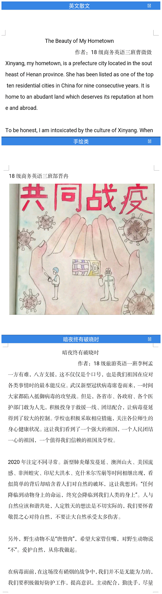 此项活动一经宣传,引起学子们的积极响应,提交了很多诗歌散文、视频、手绘作品等不同类别的作品。温暖富有力量的文字,牵动人心有感染力的视频以及生动的漫画手绘,纸短情长,一幅幅的作品里传递着同学们对疫情防控知识的掌握、对抗击疫情必胜的信心、对于青年战役者榜样力量的崇敬、对战役英雄们的致敬、对我国社会主义制度自豪的表达等等丰富的情感,同学们精心创作的作品是我院青年学子在坚定的理想信念下绽放青春力量的见证。
