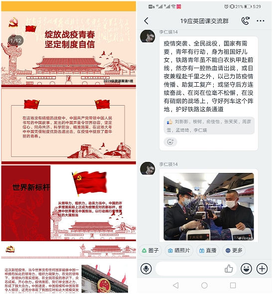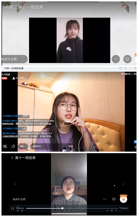 此次活动在各支部钉钉群开展。团课上,各班团支书首先带领同学们一起学习了习近平总书记给北京大学援鄂医疗队全体“90后”党员的回信精神,并通过视频向同学们展现了在中国共产党的坚强领导下,紧紧依靠人民群众,疫情防控高效有序展开,充分彰显了中国特色社会主义制度的显著优势。荣获河南省“五四红旗团支部”的18商英03班团支书任琰、积极参与家乡疫情防控受到表扬的19商英02班郭孟璇、积极开展线上宣传的新媒体部门代表19旅英01班刘斯琪与大家分享了自己参与疫情防控志愿服务的收获与感悟。同学们深受感染,纷纷表示会主动承担社会责任,坚定战胜疫情的决心,增强制度自信。