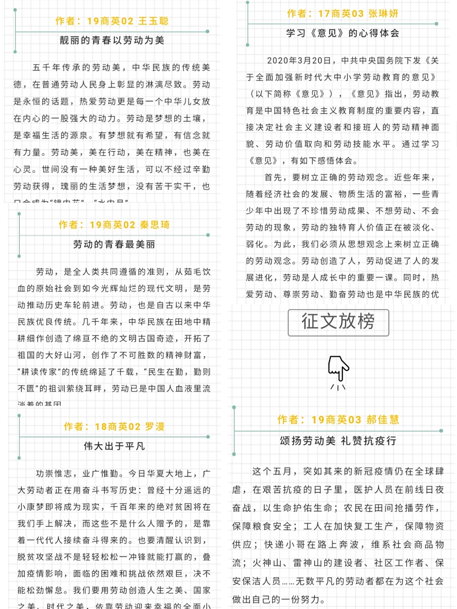 此次征文活动,得到了williamhill威廉希尔17、18、19级各班同学的积极响应,收到广泛的来稿,在来稿的文章中,19商英03的郝佳慧以个人独特的视角看到了医务人员义无反顾地出征抗疫,选择了用劳动战胜病毒,阐述了个人对劳动的理解。另外19商英02的王玉聪同学同时也告诉广大同学“靓丽的青春以劳动为美”。我们要用劳动而实现价值,这样的青春才是美丽的。