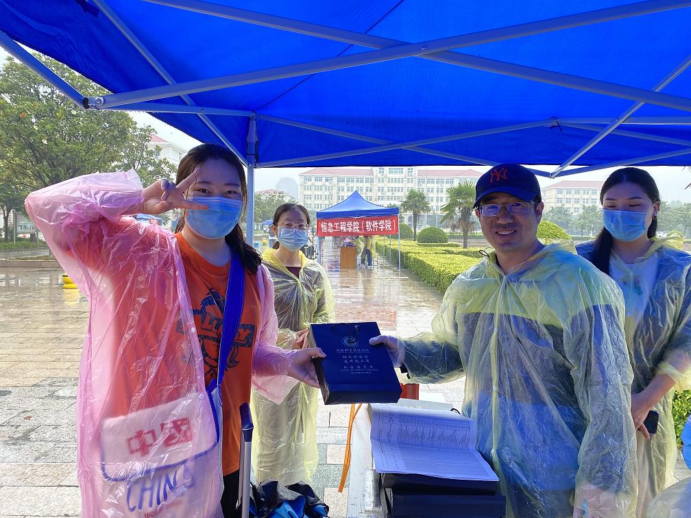 早上6点多,老师们就已从龙子湖校区赶到英才校区。冒着大雨,副书记李燚带领辅导员老师搭帐篷、抬桌子、准备发放材料,迎接工作分工明确,有条不紊。学生按照学校要求依次扫码入校,到达学院接待处。现场老师进行信息登记、检查收取“三单一书一表”、发放宿舍门卡、防疫物资、雨具和毕业纪念品。大雨倾盆,老师们不辞辛苦,坚守岗位,同学们倍感温暖和感动。