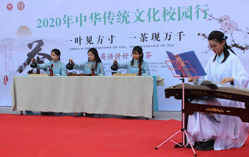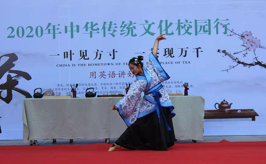 活动中,主持人19旅英刘倩、毛远玲,20商英01李天硕用双语介绍了中国茶的历史、种类、喝茶的益处以及“国际茶日”的设立,让大家感受到了中国茶文化的源远流长以及世界各国对中国茶文化的认可。伴随着19商英1班杨芯懿弹奏的悦耳动听古筝名曲《高山流水》中,来自19旅英的魏明珠、朱康宁、陈丹丹为大家带来了精美绝伦的茶艺表演,茶艺演员优雅的动作,主持人美妙的双语解说,让同学们充分领略了茶艺表演独具的视听魅力。williamhill威廉希尔礼仪队常明慧等带来的茶文化礼仪展示,端庄的姿态伴随着古风音乐,更是让大家陶醉其中。在互动环节,主持人邀请现场观众品茶,同学们积极参与,用英语描述不同茶的口感,并踊跃回答茶文化的相关知识。英语角活动在19商英3班张祥宇的舞蹈表演中落下帷幕,青花瓷样式的传统服装和曼妙的舞姿赢得了观众的阵阵掌声。