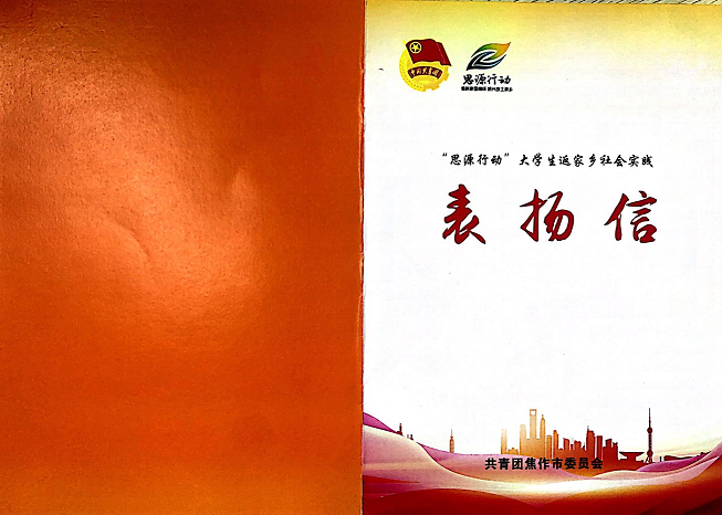 近日,共青团焦作市委员会发来表扬信,对williamhill威廉希尔2019级旅游英语专业学生程文超在焦作市“思源行动”大学生返家乡社会实践活动中的突出表现予以表扬和感谢。