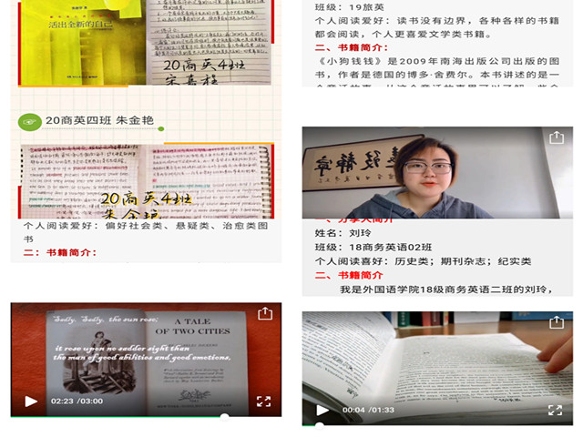 各班广泛积极宣传,同学们参与程度高,活动效果良好。在活动期间,同学们每天撰写读书心得和摘抄笔记,并在朋友圈进行拍照打卡。各班组建读书活动分享群,参与成员每天将朋友圈截图和手写笔记在群内进行分享,交流自己的读书心得和收获。假期期间,学院共收到读书文字、视频和音频作品近百篇,优秀作品在学院微信公众号上进行了推送,为同学们提供了交流学习和自我展示的平台。