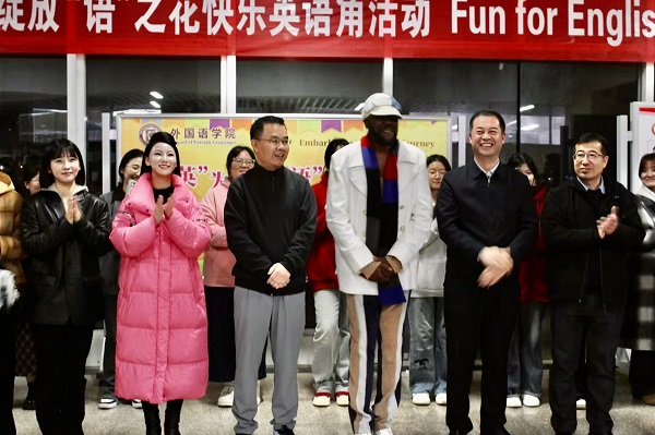 在外教互动交流环节中,邀请英语角指导的外教老师Emmanuel先生发言并演唱英文歌。他表示,很开心能和同学们交流,希望大家勇敢说英语,感受英语文化的魅力。