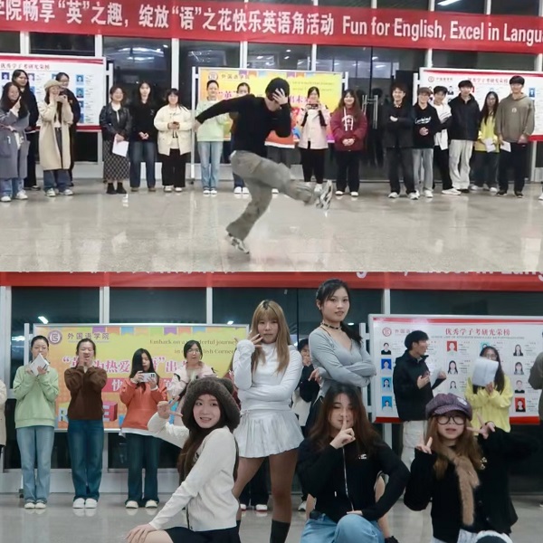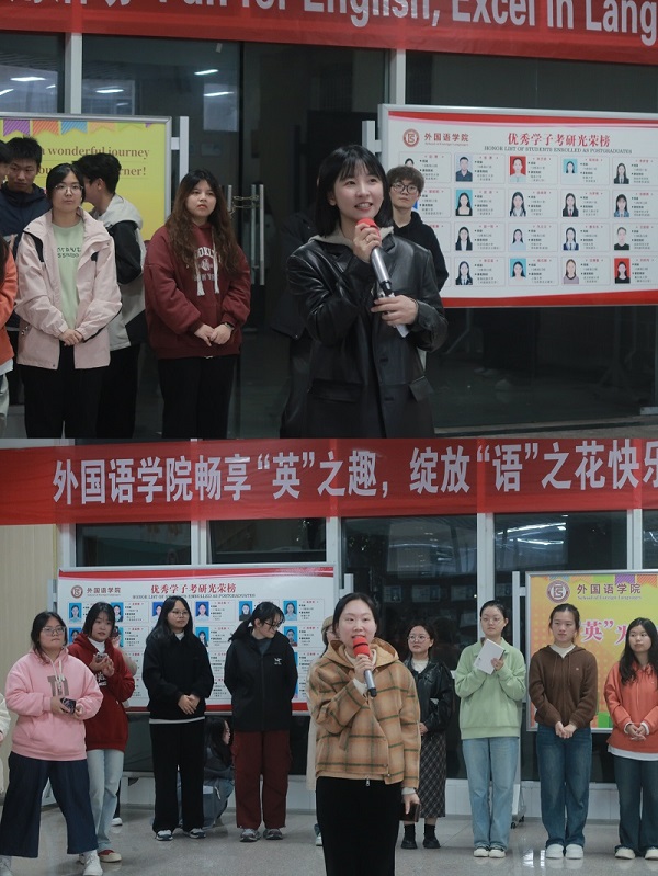 在游戏互动环节中,单词接龙游戏让大家在紧张刺激中巩固学习词汇,有的同学为师生献上歌曲等才艺表演。