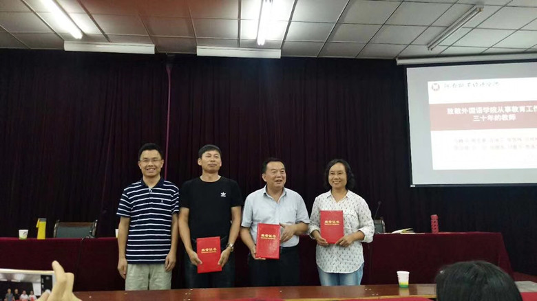 9月13日下午,williamhill威廉希尔在英才校区E109教室举行隆重仪式,向我院从事教育工作30周年以上的教师致敬,院领导分别向弓峰山、陈东景、许海兰、张雪梅、宫桂梅、高立琴、方文、张继英、刘喜芳、贾遂芝等10位教师颁发了“从事教育工作30年”荣誉证书,年轻教师代表向10位老师献花祝贺。