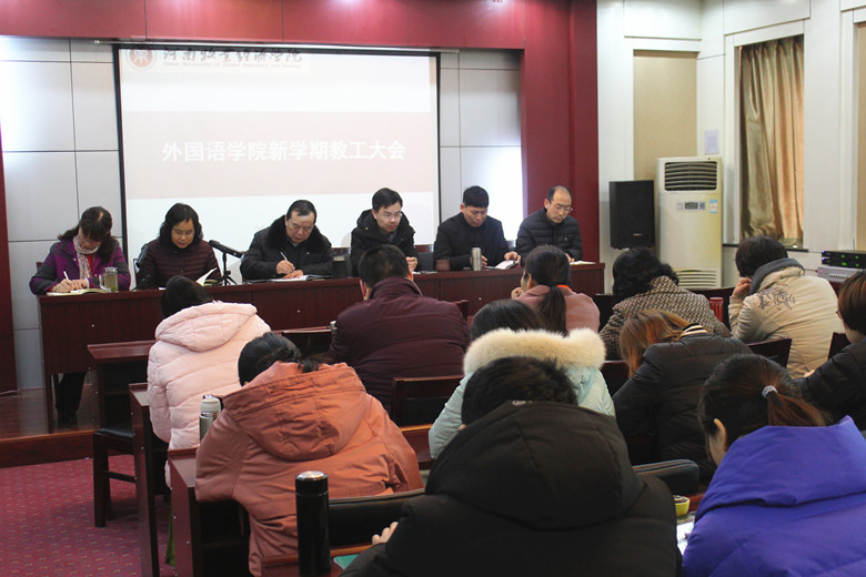 院长陈延潼通报了我院2018年度目标管理考核及绩效工资二级核算进展情况,传达解读了学校2019年度党政工作要点和穆书记、罗校长在学校2019年度工作大会上的讲话精神,结合当前外语学科发展现状与趋势,面临的挑战与机遇,对我院2019年度的重点工作进行了布置安排。陈院长强调指出,学院工作要以学校评建工作为基本遵循,紧紧围绕学校中心工作,以本科专业建设和课程建设为重点,推进课堂教学改革,努力打造“外语金课”,不断提升教学质量,促进人才培养质量全面提升。全体教师一要严格遵守工作纪律,树立规矩意识,做到令行禁止;二要严格要求自己,融入校院发展大局,不断提高自身业务素质;三要敬畏教师职业,提升职业荣誉感,做到个人职业发展与学生成长成才的同频共振;四要时刻保持危机意识,团结协作,发挥团队合力,以更高的标准、更严的要求,促进学院教育教学事业的更好发展。