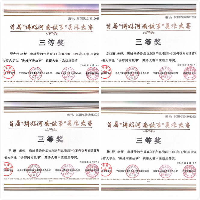 近日,由河南省教育厅、中共河南省委外事工作委员办公室、河南省人民政府新闻办公室、河南省翻译协会联合举办的首届河南省大学生“讲好河南故事”英语大赛公布比赛结果,我校四名学生在比赛中荣获三等奖,四名教师获得优秀指导教师奖。