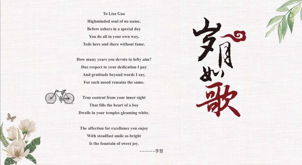 欢送会开始,高老师所在的大学英语教研一室的全体教师为高老师献上一首双语诗朗诵。由我院青年教师李晋倾情创作的英语十四行诗,讴歌了高老师三十五年如一日,默默耕耘、辛勤付出的奉献精神和淡泊名利,甘为人梯的高风亮节。随后,williamhill威廉希尔党委书记王明栓代表全体教师向高老师的光荣退休表示热烈祝贺,并致以诚挚的敬意!王书记向高老师颁发特别贡献奖证书,他充分肯定了高老师过硬的教育教学功底以及桃李满天下的育人贡献,对高老师为学校的建设与发展所付出的辛勤劳动和贡献表示衷心感谢!副院长许海兰、马媛媛代表全体教师向高老师送上了全体教工的一份心意。