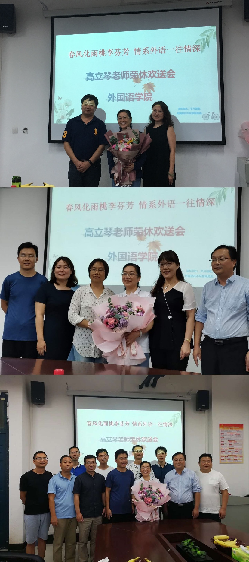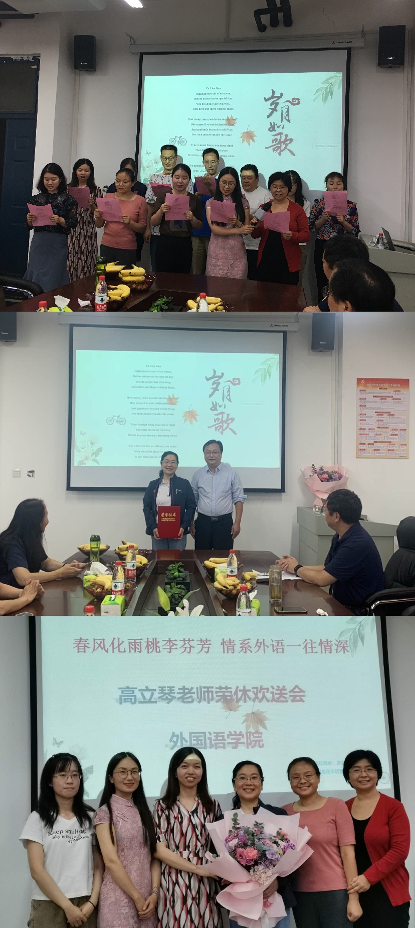 一段经过精心剪辑制作的VCR展示了高老师35年教学生涯中的精彩画面,伴随着《相亲相爱一家人》的音乐,与会老师们纷纷回忆起与高老师相处的点点滴滴,很多人眼含热泪,尽显依依不舍之情。