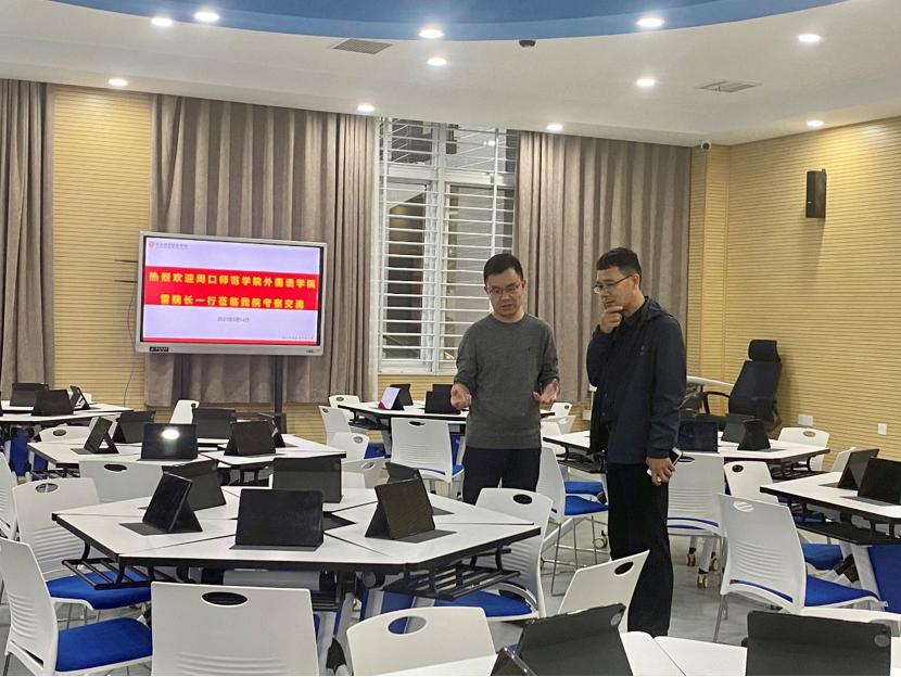 5月14日下午,周口师范学院williamhill威廉希尔副院长雷超一行到我院考察交流虚拟仿真语言实验室建设工作。