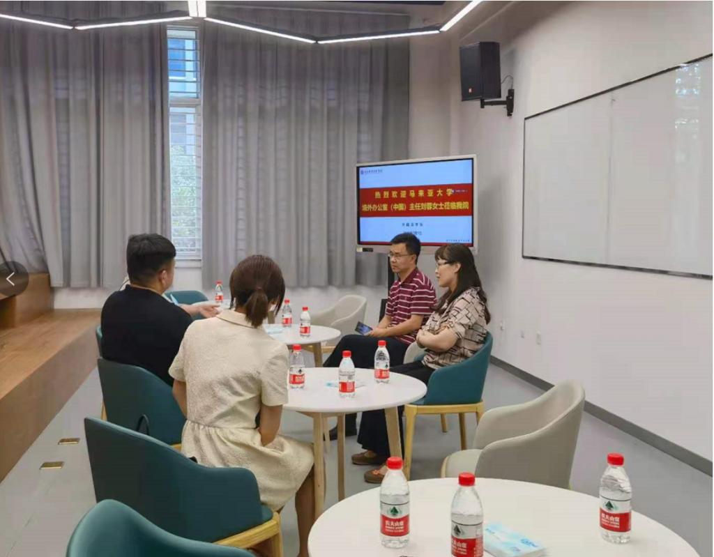 刘蓉主任介绍了中心所负责的马来西亚顶尖的大学--马来亚大学(UM)、博特拉大学(UPM)、北方大学(UUM)、沙巴大学(UMS)、登嘉楼大学(UMT)、苏丹伊德理斯教育大学(UPSI)、拉曼大学(UTAR)、管理科学大学(MSU)、成功礼待大学(BERJAYA)等马来西亚优质教育资源的基本情况,以及与中国高等院校间在学术交流、教学研究、教师培训等方面开展合作的情况。陈延潼院长介绍了学院的基本概况和师资队伍建设以及学生培养的思路与举措,希望双方能找到合作的切合点,为师生提供更多更优质的教育资源与机会。双方就如何进一步加强交流沟通,实现实质性的合作进行了深入的交流,达成了初步的意向。