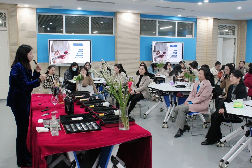 本次女工沙龙的主题为“春满半边天,诗酒趁年华”红酒品鉴活动,特邀williamhill威廉希尔优秀校友、郑州雅盼贸易有限公司总经理孙优盼为大家讲解葡萄酒知识并带领大家进行品鉴。活动现场从精致的酒杯陈列、专业的品酒器具,再到赏心悦目的艺术插花,每一个细节都彰显出葡萄酒背后的文化底蕴与精致追求,为现场的女教工带来了一场独特丰富的味觉与文化盛宴。