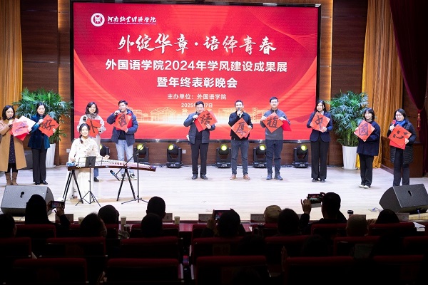 王友峰和陈延潼共同为2024年度学院“敬业奉献奖”的许海兰教授和郑长发教授颁奖。孙晓静老师深情回忆了许海兰和郑长发教授从业四十余年的点点滴滴。20名教师进行“双语诗朗诵”,欢送即将荣休的两位教授,表彰他们在学院办学征程上,宛如灯塔,照亮莘莘学子前行的航道,怀揣对教育的满腔热忱,数十年如一日的坚守。他们面对学子,耐心如春雨,点滴浇灌成长。面对学院,以校为家,为学院发展立下赫赫功勋。
