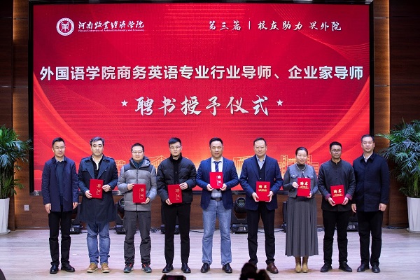 学院领导为吉蛋堂农业有限公司、94级校友、校友会会长黄明哲;听道教育集团创始人董事长、94级校友夏胜男;丹尼斯奥莱天地总经理、99级校友彭天杰;步威数码科技(上海)有限公司总经理、02级校友黄伟;郑州盛博文化传播有限公司总经理、08级校友李友君;中菲海外文化发展(河南)有限公司总经理、08级校友李金成以及校企合作伙伴新道科技股份有限公司河南分公司总经理郑胤颁奖。